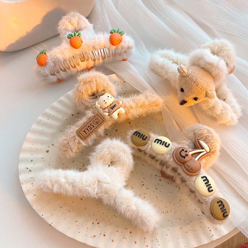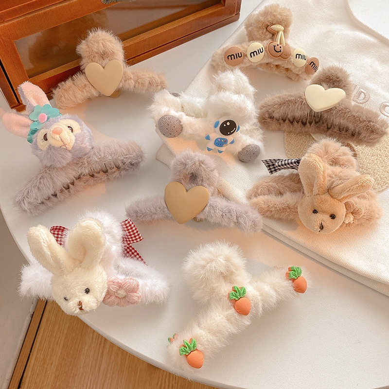 Cute Bear Strawberry Plush Hair Claw Clip Rabbit Astronauts Heart Bow Hairpin for Women Hair Accessories