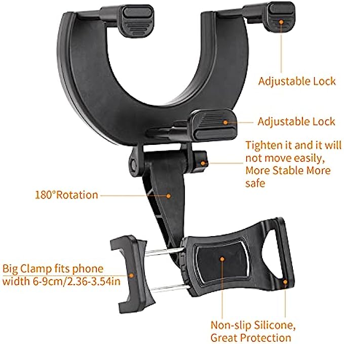 • Widely Compatible Cell Phone Automobile Cradle: The car holder for cell phone extendable clamps can clip to different thickness(2.2-5.2cm/0.86-2.04in) & height(5.3-8cm/2.08-3.15in) of rear view mirrors, and perfectly fit most vehicles such as trucks, pickup trucks & SUVs (not for rear view mirrors with a row of buttons or thickness more than 2.04”)