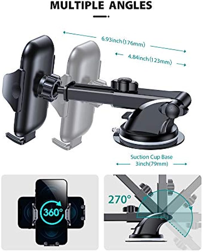 • Long Arm Design & Multiple Viewing Angle: The car mount for iPhone 11 has a telescopic arm that extends from 4.84" - 9.05" and can pivot up or down for a variety of angles which optimizes viewing capabilities. This car holder for cell phone has a highly flexible ball-joint 360° rotation that provides infinite viewing angles. Position your phone at the perfect angle to enjoy a more relaxed and safer drive.