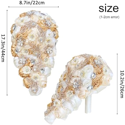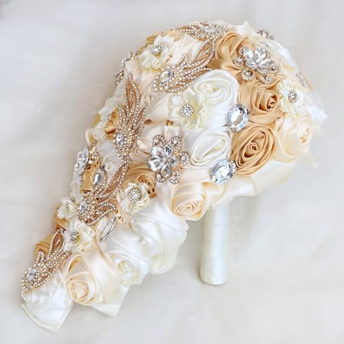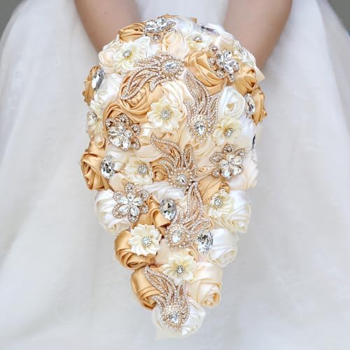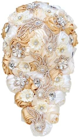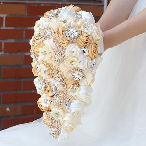 Sponsored Ad - Cascade Wedding Bridal Bouquet Silk Rose Artificial Flower Bride Holding Toss Bouquets Beaded Rhinestone Crystals Pendant Waterfall Drop Flowers Bunch Light Khaki and Ivory 8.7 Inch