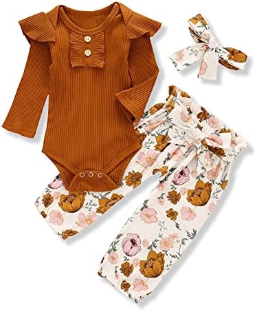 Newborn Baby Girls Clothes Ribbed Ruffled Romper+Floral Pants+Headband Infant Outfit Set