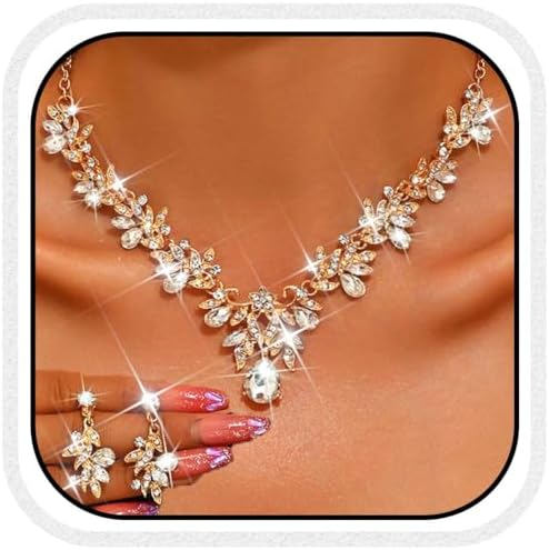 Unicra Rhinestone Bridal Wedding Jewelry Sets Gold Necklace Earrings Set Leaf Prom Formal Costume Jewelry Set for Women and Brides