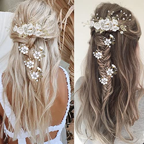 5 PCS Bridal Flower Wedding Hair Pins Crystal Pearl Hair Clips Headpiece Gold Wedding Hair Accessories Jewelry with Rhinestone for Brides Bridesmaids Women Girls Updo (Pure White Flower)